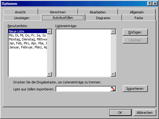 In Excel stellen Sie Aufzählungen unter Extras – Optionen... – Register AutoAusfüllen ein, sh. Abb. 4-58 :