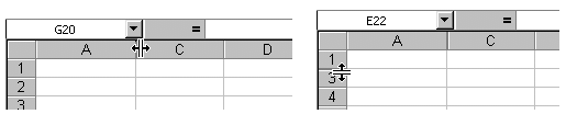 Eine ausgeblendete Spalte können Sie auch folgendermaßen wieder sichtbar machen: Bewegen Sie den Mauszeiger von rechts an die Trennlinie zwischen zwei Spaltenköpfen, die die ausgeblendete Spalte einschließen (Abb. 4-54 ). Drücken und halten Sie die linke Maustaste und ziehen Sie die Spaltentrennlinie nach rechts. Analog können Sie eine Zeile wieder einblenden. Bewegen Sie den Mauszeiger von unten an die Trennlinie zwischen zwei Zeilenköpfen, bis der Zeiger so aussieht wie in Abb. 4-54 . Ziehen Sie die Maus bei gedrückter linker Taste nach unten, bis die ausgeblendete Zeile wieder sichtbar ist. Beachten Sie: Wenn die Spaltenbreite oder Zeilenhöhe mit der Maus verändert werden soll, sieht der Mauszeiger so aus wie in Abb. 4-55 .